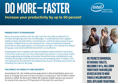 Premium performance is the key to reliable applications that keep workers independent and focused. The latest Intel® Core™ vPro™ processor-based devices are optimized for Microsoft Office* and other top business applications to streamline efficiency across the most demanding workloads, including complex Excel calculations and charts. Multitasking is also smoother, thanks to increased responsiveness enabled through Intel speed shift technology.